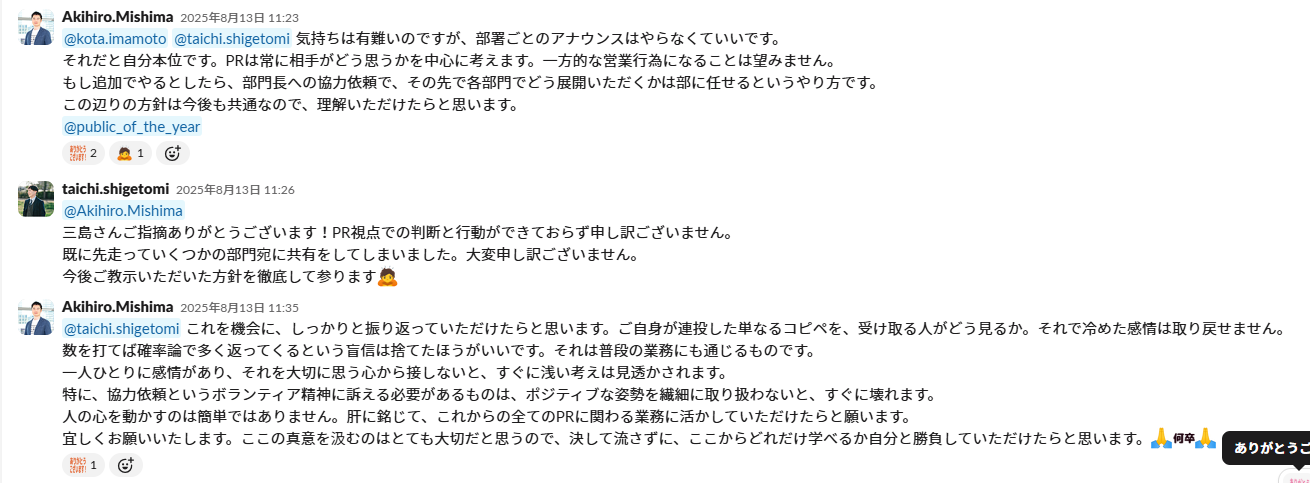 Public of The Year2025の責任者は取締役の三島さんでした。三島さんは私が以前事務局を担当した社員総会の責任者も務めていたので、前回より成長した自分を三島さんに見てもらうんだと意気込んでいました。