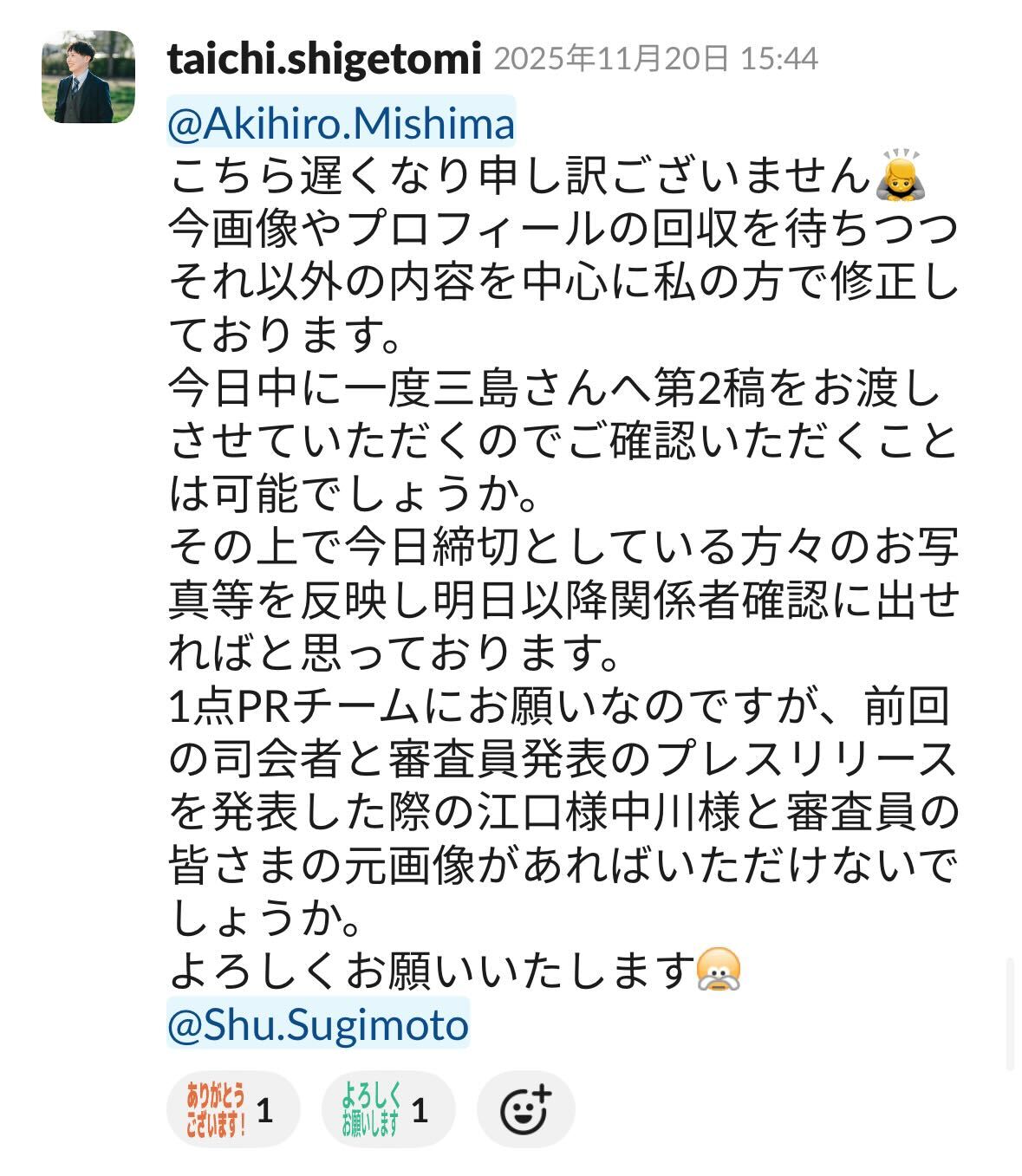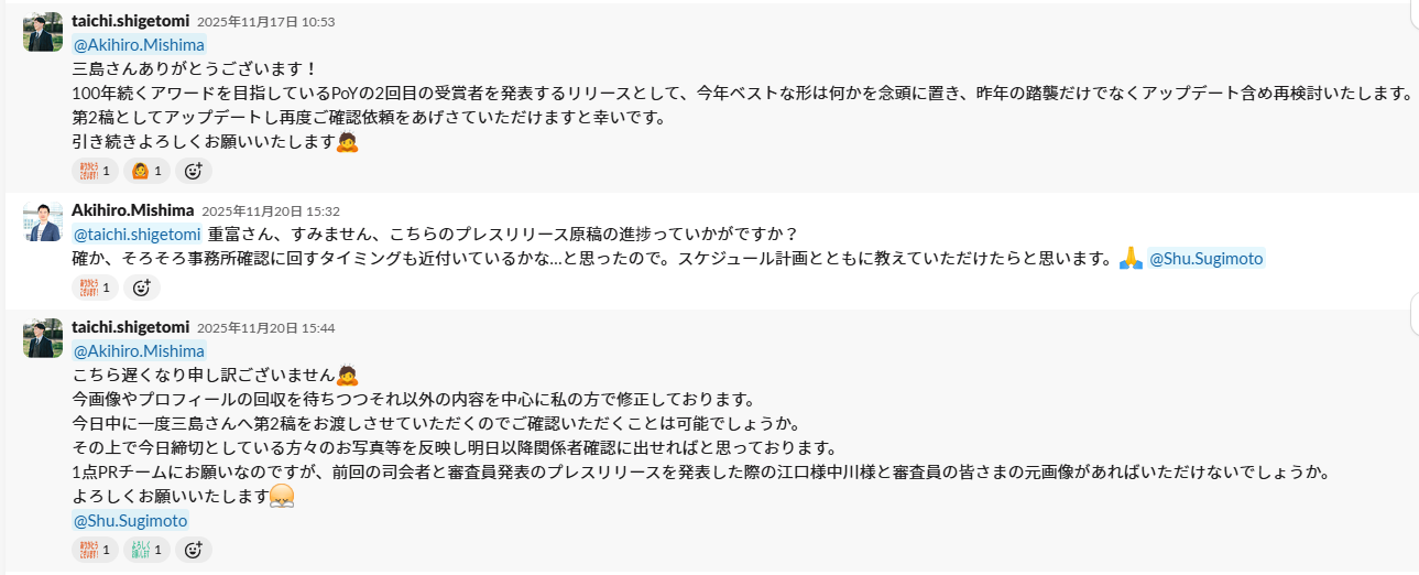 受賞者発表のプレスリリース作成時、三島さんへプレスリリース発信が期日通りにできるように進め方の相談をする際のやり取り