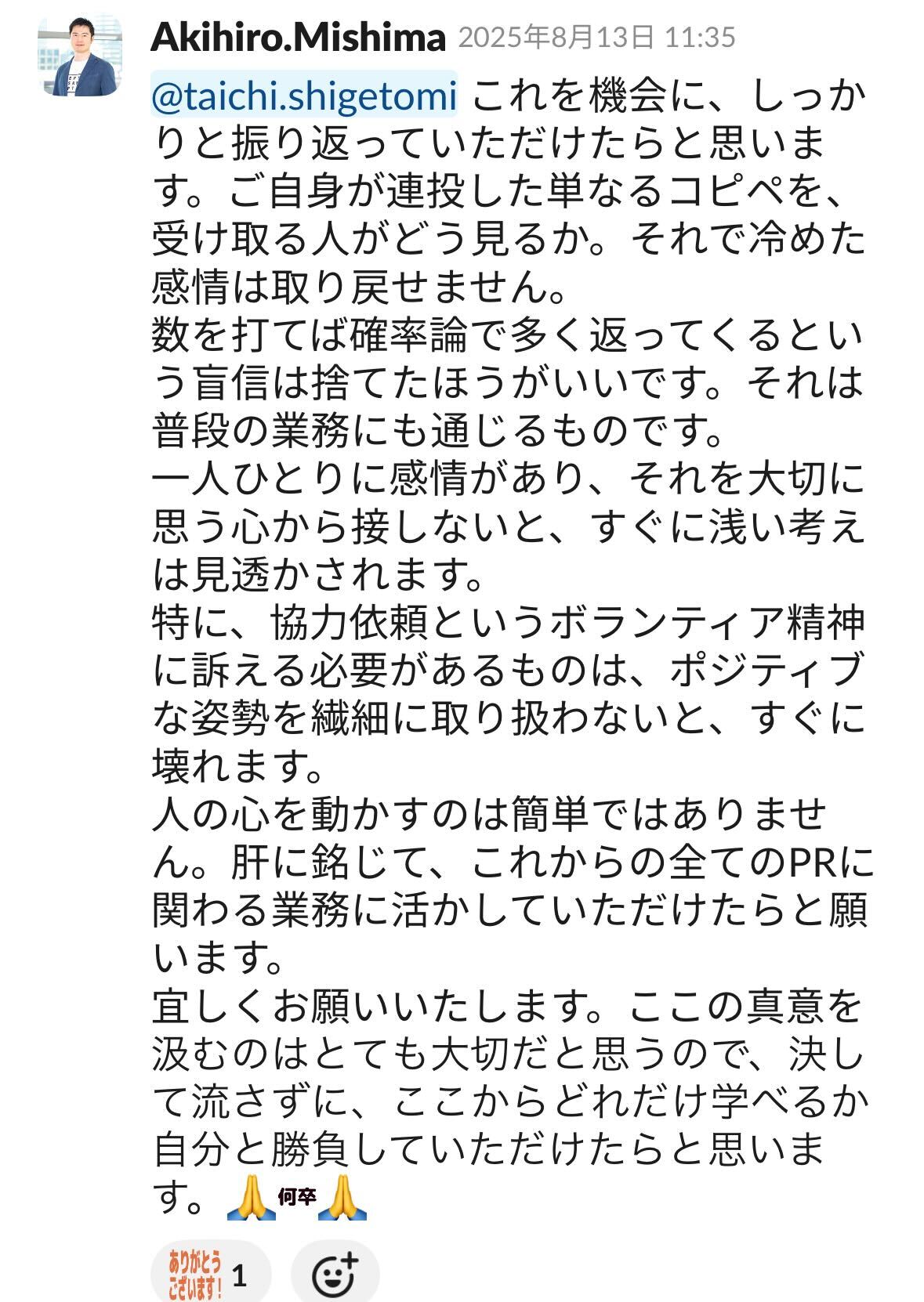 三島さんからいただくフィードバックはどれも的確で、いつもSlackで通知がくるたびにはっとさせられていました。一方で理解はしつつも、根本的には変われない自分がいました。